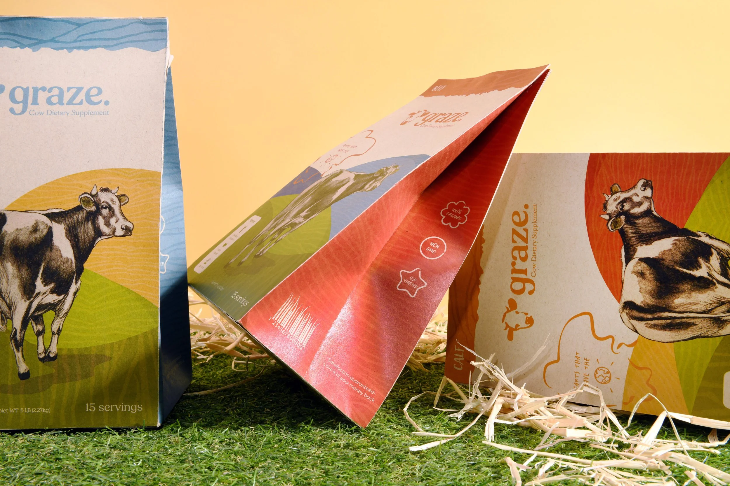 The packaging system covers three distinct SKUs — beef, dairy, and calves — each tailored to the specific supplemental needs of that animal type, distributed where farmers already shop: Tractor Supply, Home Depot, Lowe’s, and direct online.